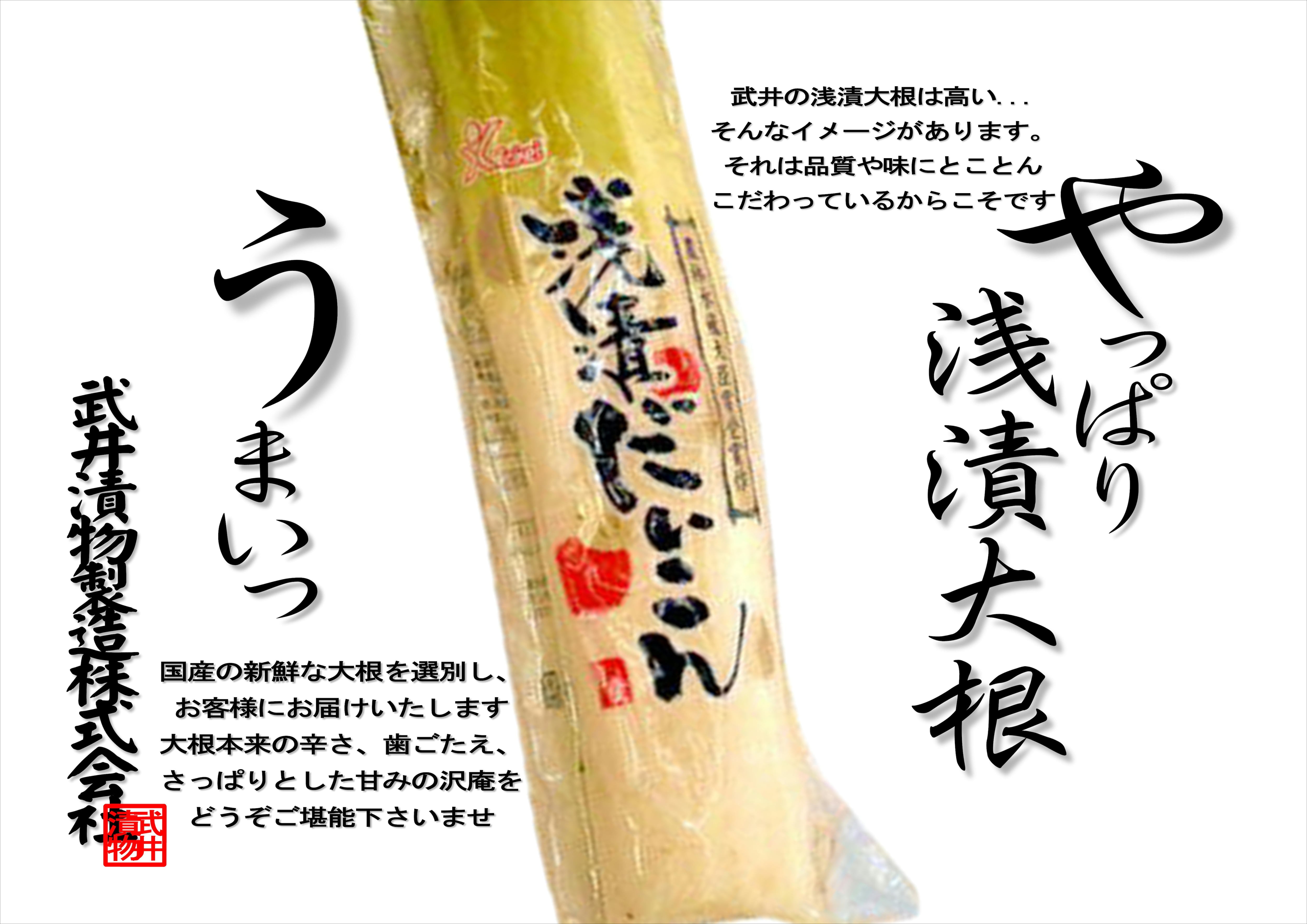 当店一番人気の「浅漬大根(白)」。地元生産農家を中心に、新鮮な大根を随時仕入れ、昔ながらの「糖絞り」という技法で漬け込むからこそ、味わえる、地元薮塚が誇る逸品です。